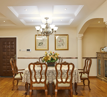 是以中國(guó)傳統(tǒng)文化作為背景,在色彩搭配上以黑、紅、為主,室內(nèi)多采用對(duì)稱(chēng)式的布局方式,格調(diào)高雅,造型簡(jiǎn)樸優(yōu)美,色彩濃重而成熟。